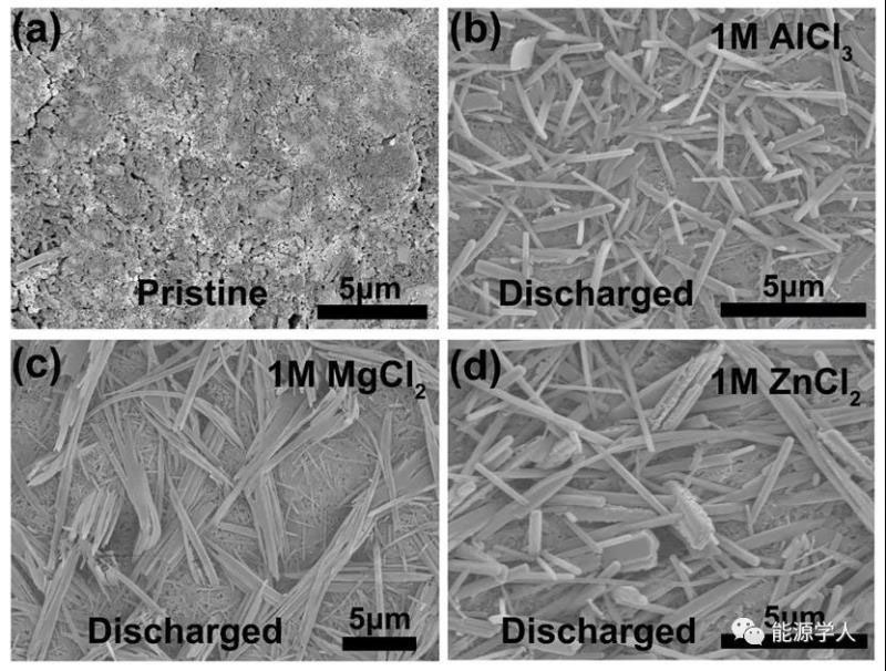 進一步地,研究者利用掃描電子顯微鏡觀察了AQ電極循環(huán)前,第一次還原后的電極形貌,如圖3所示。相比于循環(huán)前平整的電極表面,在不同電解液中經(jīng)過第一次還原之后的電極表面出現(xiàn)了很多棒狀物質(zhì),這表明了有物質(zhì)在電極表面成核和生長。結(jié)合還原電勢的推斷,研究者提出了質(zhì)子輔助金屬離子置換反應(yīng)機理,AQ獲得兩電子與質(zhì)子耦合生成AQ-H2,而AQ-H2在水中溶解度要高于AQ,因此有部分AQ-H2從電極內(nèi)部溶出到電極表面,與金屬離子發(fā)生置換生成AQ-M,M為Al, Zn, Mg。AQ-M在電極表面成核和生長為棒狀新相。反應(yīng)機理如圖4所示。