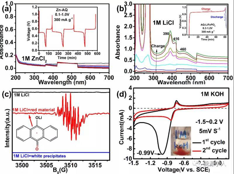 圖2. (a) Zn-AQ電池,(b) AQ-LiFePO4電池的原位紫外可見光光譜,(c)紅色物質(zhì)的電子自旋共振譜,(d) AQ電極在1MKOH溶液中的CV曲線。