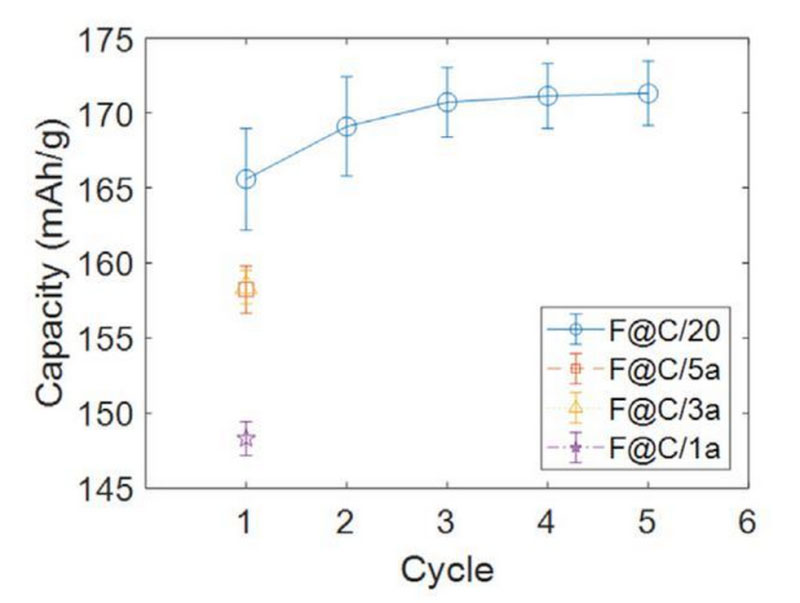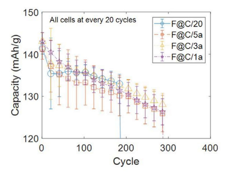 雖然不同的化成電流會導(dǎo)致不同的化成容量發(fā)揮,但是在循環(huán)過程中我們發(fā)現(xiàn)這些電池之間沒有明顯的差距,在1C/1C倍率下循環(huán)的幾種電池的容量發(fā)揮和循環(huán)穩(wěn)定性幾乎相同,表明不同電流下化成的電池,最終負極表面都形成了穩(wěn)定的SEI膜。因此作者認為采用上述的分段式快速化成制度能夠在化成過程中部分的形成SEI膜,然后在鋰離子電池使用的前幾次循環(huán)中最終完成穩(wěn)定SEI膜的構(gòu)建,從而在大幅壓縮化成時間、降低成本的同時還能夠獲得相近的循環(huán)壽命。