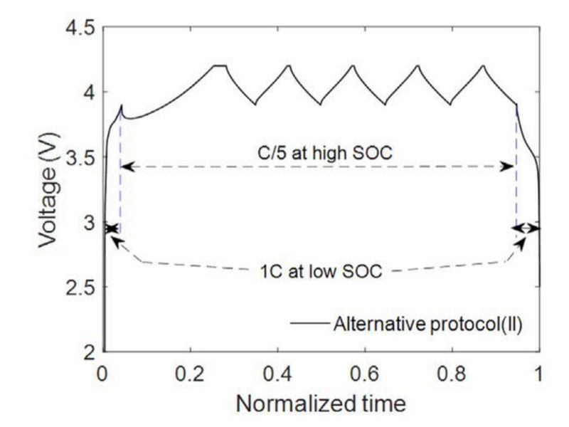 為了壓縮化成時間,降低生產(chǎn)成本,美國橡樹嶺國家實驗室在1.5Ah的NCM/石墨軟包鋰離子電池上設(shè)計了一種快速化成的制度(如下圖所示),在這一制度下首先以較大的電流(1C)將鋰離子電池充電到3.9V,然后以C/5倍率在3.9-4.2V的范圍內(nèi)對鋰離子電池進行充放電循環(huán),最后將電池放電到3.0V,相比于以0.05C倍率進行3次循環(huán),該制度下電池的化成時間僅需要14h,化成速度提高8.5倍。這一化成制度的設(shè)計思路主要是將負極在較低電勢范圍內(nèi)時,充電電流盡量盡可能的小,以使負極形成更為致密和穩(wěn)定的SEI膜。