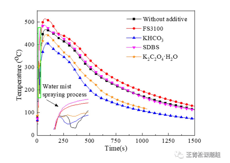 (4)進(jìn)一步,為了改良細(xì)水霧的滅火與降溫性能,本文還研究了含有鹽類添加劑和表面活性劑的細(xì)水霧的降溫效果。結(jié)果表明,含有KHCO3和K2C2O4?H2O添加劑的細(xì)水霧表現(xiàn)出較好的滅火和降溫效果,而含有十二烷基苯磺酸鈉陰離子表面活性劑和FS3100氟類非離子表面活性劑的細(xì)水霧的滅火和降溫效果則較差,如圖4所示。