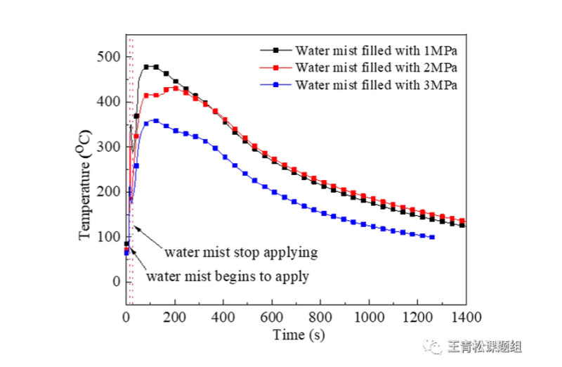 (3)通過研究不同工作壓力下細(xì)水霧對熱失控電池的降溫效果,發(fā)現(xiàn)隨著細(xì)水霧工作壓力的增加,其降溫效果越優(yōu)異,如圖3所示。
