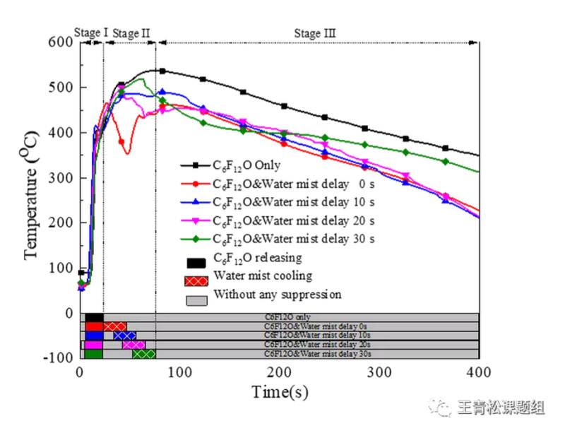 (2)實驗中,通過硬件設(shè)計結(jié)合軟件編程實現(xiàn)全氟己酮和細(xì)水霧復(fù)合系統(tǒng)的聯(lián)動設(shè)計,改變?nèi)和图?xì)水霧系統(tǒng)的釋放間隔,依此模擬實踐中細(xì)水霧在大規(guī)模儲能電站遠(yuǎn)距離運(yùn)輸中可能產(chǎn)生釋放延遲的問題。我們發(fā)現(xiàn)兩系統(tǒng)施加的時間間隔將影響復(fù)合系統(tǒng)的降溫效果,即隨著施加時間間隔的增加,復(fù)合系統(tǒng)對熱失控電池的降溫效果變差。如圖2所示。