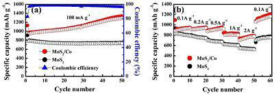 圖1. MoS2/Co復(fù)合材料的循環(huán)和倍率性能。