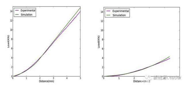 對(duì)擠壓試驗(yàn)中單個(gè)電池和三個(gè)電池疊放模型進(jìn)行模擬的曲線如下圖所示,其中左邊的為單只電池,右邊的為三只電池疊放在一起,從圖上可以看到模擬結(jié)果與試驗(yàn)結(jié)果十分接近。由于三只電池疊放在一起,單只電池受到的載荷明顯減小。