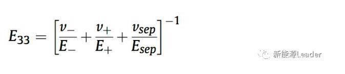多層電極的特性通過(guò)下式,根據(jù)正極、負(fù)極和隔膜的特性計(jì)算而得,其中E和v分別是彈性模量和體積分?jǐn)?shù)。