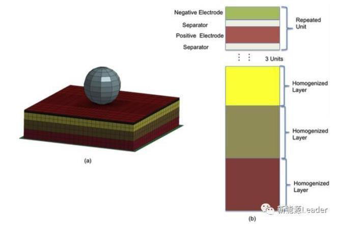 為了研究造成擠壓試驗(yàn)中電池短路的原因,Hsin Wang利用FEM軟件對(duì)電池的擠壓造成的熱失控進(jìn)行了研究。模型分別對(duì)單只電池和三只電池疊放在一起的情況進(jìn)行了研究。Hsin Wang采用MAT-63材料模型對(duì)電極進(jìn)行了模擬,擠壓球采用了剛性球模型,接觸點(diǎn)則采用了實(shí)體接觸模型,摩擦系數(shù)為0.3,具體模型如下圖所示。