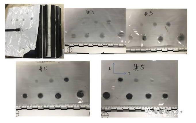通過(guò)對(duì)擠壓試驗(yàn)后的電池進(jìn)行拆解,拆解后的隔膜圖片如下圖所示,從圖上可以看到隨著變形量的增大,隔膜逐漸變薄,同時(shí)由于隔膜在橫向和縱向上的強(qiáng)度不同,使得壓痕呈現(xiàn)橢圓形而不是圓形,該結(jié)果顯示隔膜變薄可能是導(dǎo)致擠壓試驗(yàn)中電池短路發(fā)生的主要原因。