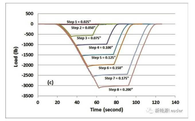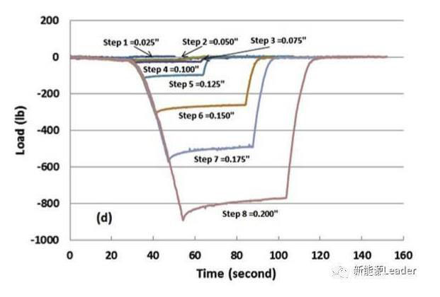 三只電池疊放在一起的載荷vs時(shí)間曲線如下圖所示,從圖上可以看出由于三只電池疊放在一起,提供了很大的緩沖,因此在開始變形量較小時(shí),加在電池上的載荷十分?。?lt;50磅),從Step 4開始,變形量達(dá)到0.1英寸時(shí),電池才開始產(chǎn)生較大的線形載荷,同時(shí)我們也從兩圖中注意到在相同的變形量下,三只電池疊放在一起時(shí)電池受到的載荷明顯要小于單只電池受到的載荷。進(jìn)一步的研究顯示,當(dāng)三只電池疊放在一起時(shí),電池最大的變形量可以達(dá)到單個(gè)電池厚度的90%。