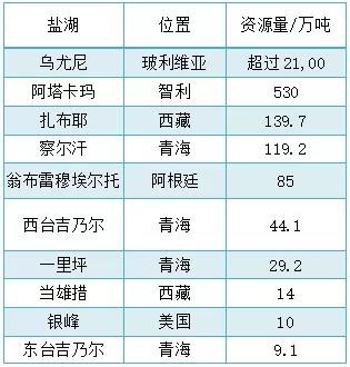 全球主要鹽湖鹵水型鋰礦床(資源量以碳酸鋰 計)
