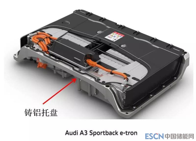 這種結(jié)構(gòu)的托盤,框架結(jié)構(gòu)特點不明顯,但是,整體強(qiáng)度可以滿足電池承截要求。常見于小能量電池系統(tǒng)結(jié)構(gòu)。如下圖的Audi A3壓鑄托盤。