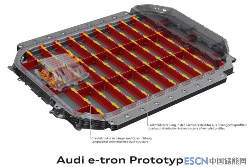 托盤的鋁制吊耳固定點應(yīng)數(shù)量多,而且布置均勻,如下圖奧迪 e-tron鋁托盤案例所示。