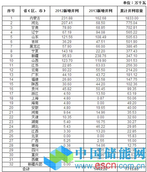 表4:全國各省2013年累計風(fēng)電并網(wǎng)容量統(tǒng)計表