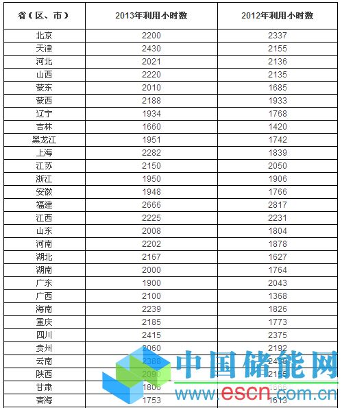 全國各省(區(qū)、市)2012和2013年的平均風(fēng)電等效滿負荷小時數(shù)如下: