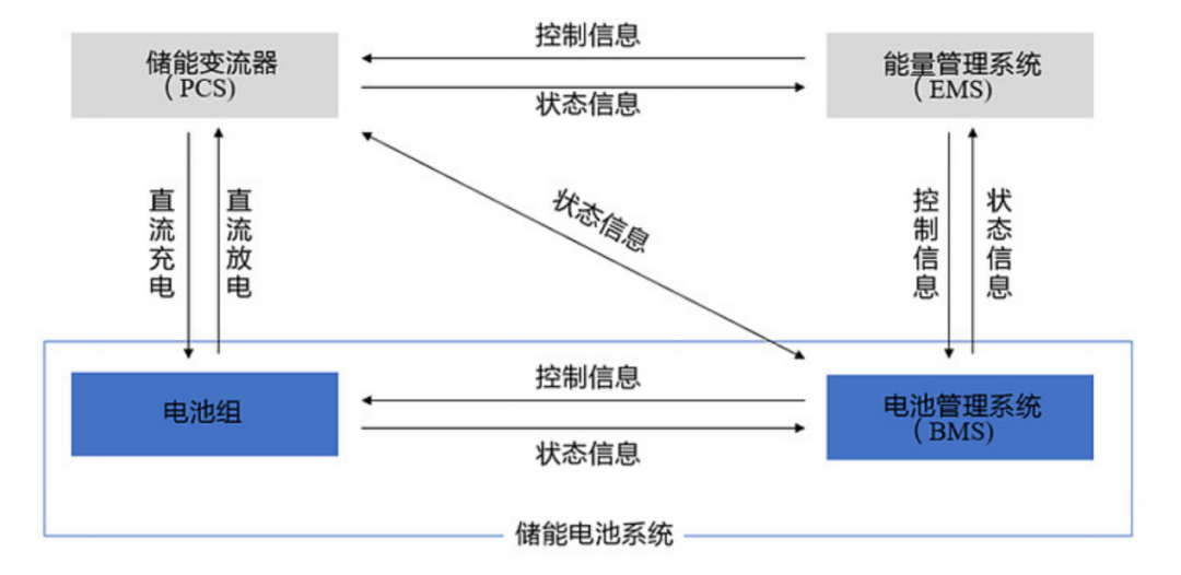 在儲能系統(tǒng)中,電池組將狀態(tài)信息反饋給電池管理系統(tǒng)(BMS),BMS將其共享給能源管理系統(tǒng)(EMS)和儲能變流器(PCS);EMS根據(jù)優(yōu)化及調(diào)度決策將控制信息下發(fā)至PCS與BMS,控制儲能電池完成充放電等工作。