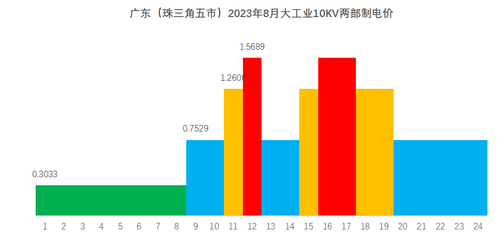 廣東省現(xiàn)行的峰平谷比價為1.7:1:0.38,尖峰電價執(zhí)行時間為7月、8月和9月三個整月,尖峰電價在峰段電價基礎上上浮25%。2023年8月廣東(珠三角五市)10KV兩部制分時電價如下: