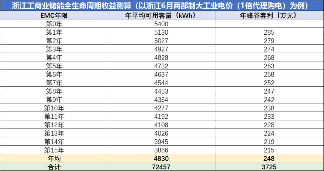 據(jù)測算,在每度峰谷電價差為0.9148元且一年運(yùn)行660次的情況下,第一年峰谷套利收入285萬元,15年峰谷套利累計收入為3725萬元,總成本為1080萬元,回本周期約為4.4年。