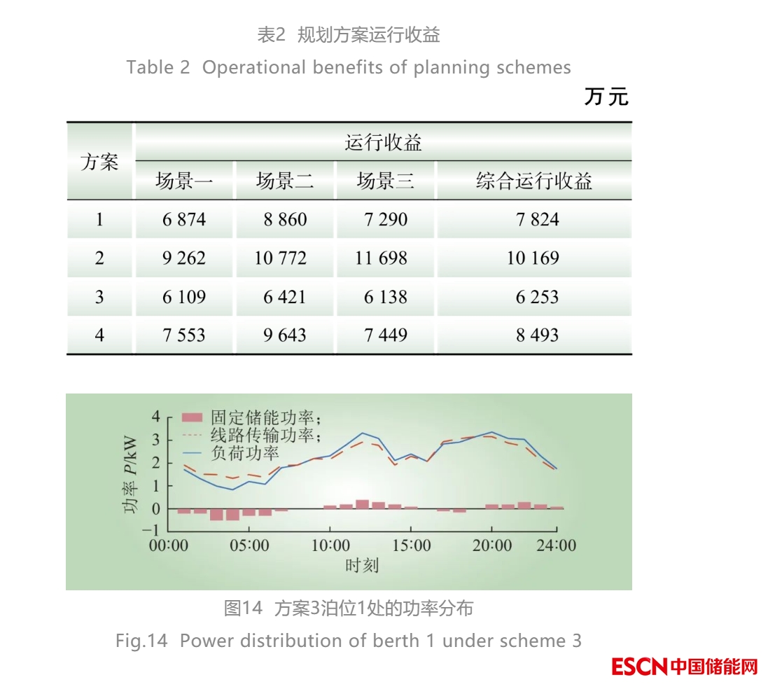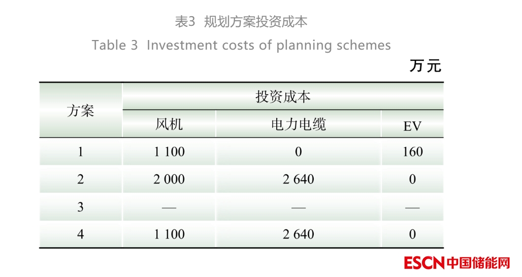 表3為規(guī)劃方案的投資成本。其中,算例結(jié)果表明,方案1在泊位2處新建風(fēng)機(jī)500 kW,泊位3處新建風(fēng)機(jī)600 kW;方案2在泊位2、3處新建風(fēng)機(jī)各1 MW;其中,方案2中海島由于存在穩(wěn)定的電力外送通道(海底電纜),風(fēng)機(jī)出力更容易被大電網(wǎng)消納,所以新建的風(fēng)機(jī)數(shù)目較方案1而言更多。需要說明,由于儲(chǔ)能電池的運(yùn)行成本是通過電池的充放電次數(shù)和投資建造成本進(jìn)行核算,所以在此不再重復(fù)計(jì)算電池的投資成本。
