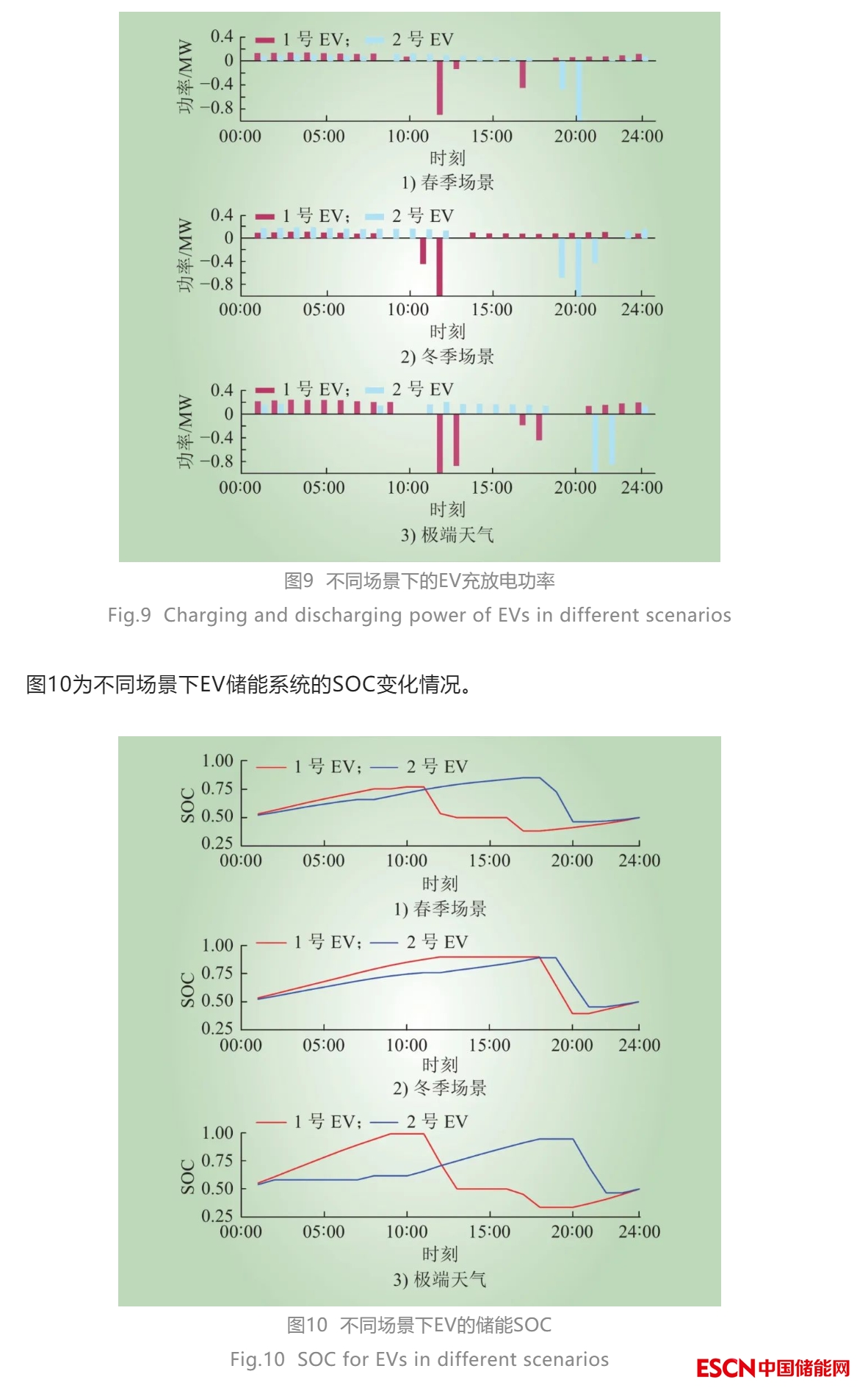 圖9為不同運(yùn)行場(chǎng)景下的EV充放電功率,其中定義充電功率為正,放電功率為負(fù)。