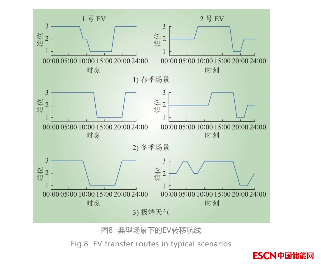 圖8為不同運(yùn)行場(chǎng)景下的EV的轉(zhuǎn)移路線。由圖8可知,EV的轉(zhuǎn)移存在時(shí)延。夏季典型場(chǎng)景下EV的傳輸路徑分別為3→2→1→3和2→3→1→2。冬季場(chǎng)景下,由于氣候變化,用電負(fù)荷和風(fēng)電的出力較夏季場(chǎng)景有所不同,冬季典型場(chǎng)景下EV的傳輸路徑為3→1→3和2→3→1→2。極端天氣下,風(fēng)能資源發(fā)生變化較大;除此之外,由于海上風(fēng)浪影響,EV的轉(zhuǎn)移時(shí)延變長(zhǎng),EV轉(zhuǎn)移路徑變?yōu)?→1→3和2→3→2→3→1→2。由此可知,不同的運(yùn)行場(chǎng)景對(duì)EV的時(shí)空轉(zhuǎn)移影響較為顯著。