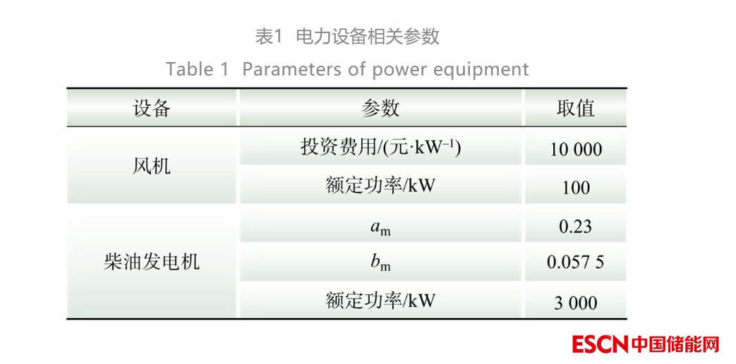 本算例選取的EV擬采用小型貨用船舶,船舶參數(shù)來自舟山市江海船舶工程設(shè)計(jì)有限公司設(shè)計(jì)的貨運(yùn)船,采用柴油驅(qū)動(dòng),航行速度為15 km/h。同等載重類型的船舶購置費(fèi)用約為50~80 萬元,本算例暫取船舶投資成本為80萬元。風(fēng)機(jī)、柴油發(fā)電機(jī)的數(shù)據(jù)如表1所示[21],其中,柴油的定價(jià)為6元/L。此外,海島微電網(wǎng)向大陸電網(wǎng)的購電費(fèi)用為0.8元/(kW·h)。
