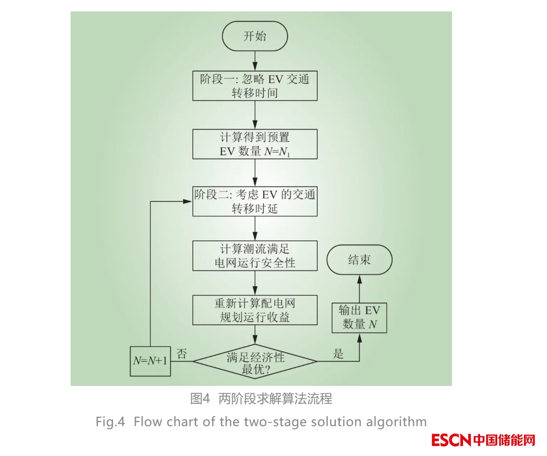 由式(33)可知,此時(shí) PEV(t) 只與 Pk,e(t) 相關(guān),實(shí)現(xiàn)了決策變量N與充放電功率 PEV(t) 的解耦,削減了模型的復(fù)雜程度,大大提升了求解速度。本節(jié)所提出的兩階段算法的求解流程如圖4所示。