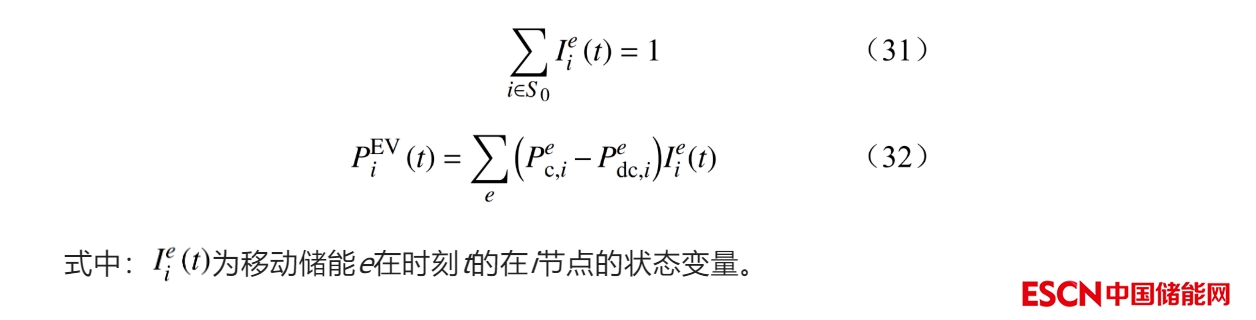 式(11)~(13)所給出的EV轉(zhuǎn)移時(shí)延模型是一個(gè)非線性的、含大量布爾型變量的表達(dá)式,模型較為復(fù)雜;若假設(shè)轉(zhuǎn)移模型中參數(shù) τ=0 ,即EV從一個(gè)停泊點(diǎn)移動(dòng)到另一個(gè)停泊點(diǎn)的轉(zhuǎn)移時(shí)間為0。注意到,由于EV瞬時(shí)轉(zhuǎn)移,EV的位置集合中不再有在各站點(diǎn)間的變量,故位置集合為 S0 。EV的相關(guān)約束松弛為式(31)所示EV在瞬時(shí)轉(zhuǎn)移時(shí)的空間位置約束、式(32)所示EV的充放電功率約束。