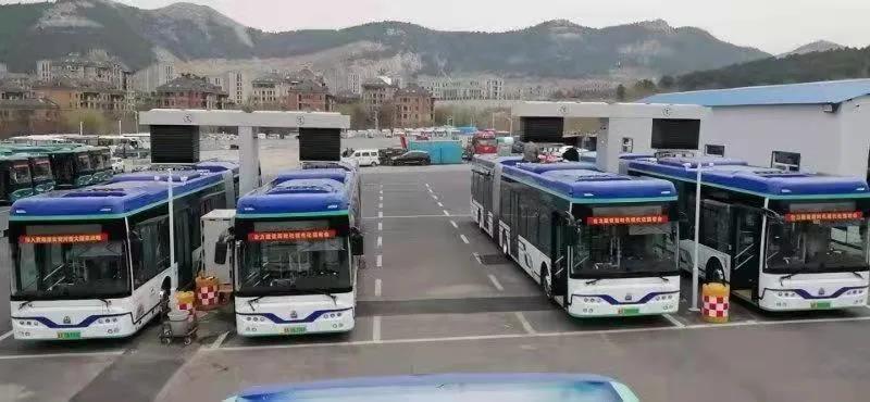 2021年秋天,在山東濟(jì)南公交媒體村公交充電站,4輛公交車正在使用充電弓進(jìn)行充電。