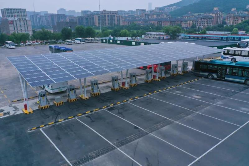 2021年8月22日,濟(jì)南公交媒體村公交充電站光伏雨棚全景,該光伏雨棚既能發(fā)電,又可以擋雨,綠色電源還為公交車進(jìn)行充電。
