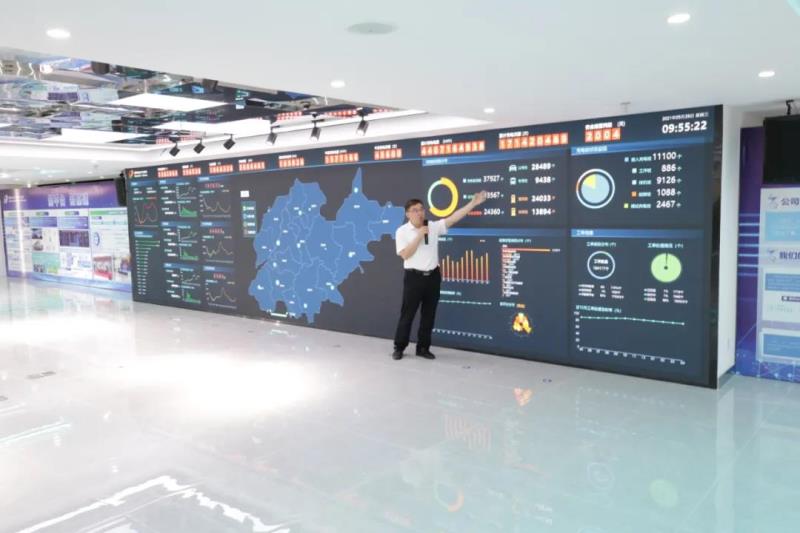 2021年5月26日,國網(wǎng)(山東)電動(dòng)汽車服務(wù)有限公司平臺(tái)部工作人員正在向參觀者講解智慧車聯(lián)網(wǎng)平臺(tái)。