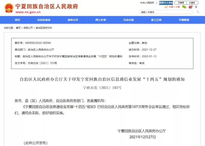 近日,寧夏回族自治區(qū)人民政府辦公廳印發(fā)《寧夏回族自治區(qū)信息通信業(yè)發(fā)展“十四五”規(guī)劃》(以下簡(jiǎn)稱《規(guī)劃》),明確了“十四五”時(shí)期推動(dòng)信息通信業(yè)發(fā)展的指導(dǎo)思想、基本原則、發(fā)展目標(biāo)、重點(diǎn)任務(wù)和保障措施。