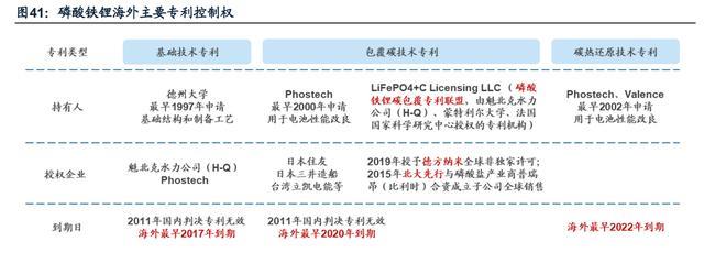 海外磷酸鐵鋰核心專利保護期結(jié)束為中國企業(yè)出海鋪路。我國鋰電產(chǎn)業(yè)起步相 對較晚,電池材料專利布局落后于歐美、日韓企業(yè),而磷酸鐵鋰的基礎(chǔ)結(jié)構(gòu)、碳包 覆、碳還原三大核心技術(shù)分別在1997年、2000年和2002年分別被德州大學(xué)諾貝爾獎 Goodenough教授團隊、加拿大魁北克水力公司和英國Valence公司申請,雖然國內(nèi) 于2011年判定磷酸鐵鋰制造技術(shù)專利無效,但仍制約國內(nèi)磷酸鐵鋰電池企業(yè)出海。 根據(jù)各國專利法相關(guān)規(guī)定,發(fā)明型專利保護期在10-20年,2017年隨著磷酸鐵鋰基 礎(chǔ)結(jié)構(gòu)的專利保護到期,國內(nèi)企業(yè)海外磷酸鐵鋰布局加快,而2022年隨著海外碳熱 還原技術(shù)專利保護期的結(jié)束,將為中國磷酸鐵鋰電池企業(yè)出海鋪路。