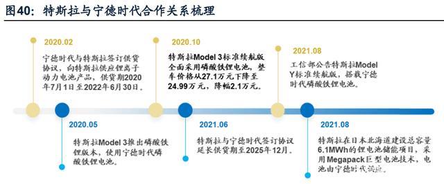 合作寧德時代,磷酸鐵鋰全球化趨勢顯現(xiàn)。2020年2月,寧德時代公告與特斯 拉簽訂為期兩年的供貨協(xié)議,向其供應(yīng)鋰動力電池,作為特斯拉目前磷酸鐵鋰電池 唯一供應(yīng)商,寧德時代助力特斯拉推出磷酸鐵鋰版Model 3和Model Y,進一步下探 整車成本提升競爭力,中國產(chǎn)業(yè)鏈完善帶來的成本優(yōu)勢凸顯。2021年6月,寧德時 代宣布與特斯拉供貨協(xié)議延長至2025年底,隨著寧德時代德國工廠的投運,磷酸鐵 鋰電池有望進一步擴大全球份額,提升市場認(rèn)可度。2021年10月,特斯拉宣布將全 球范圍內(nèi)將所有標(biāo)準(zhǔn)續(xù)航版電動車都改用磷酸鐵鋰電池,磷酸鐵鋰全球化趨勢凸顯; 儲能業(yè)務(wù)方面,特斯拉與日本電力公司Global Engineering合作的6.1GWh鋰電池儲能項目將采用特斯拉Megapack巨型電池技術(shù),電芯由寧德時代供應(yīng),根據(jù)馬斯克表 述,未來特斯拉儲能系統(tǒng)有望全部采用磷酸鐵鋰電池,重塑價格與安全性優(yōu)勢。(報告來源:未來智庫)