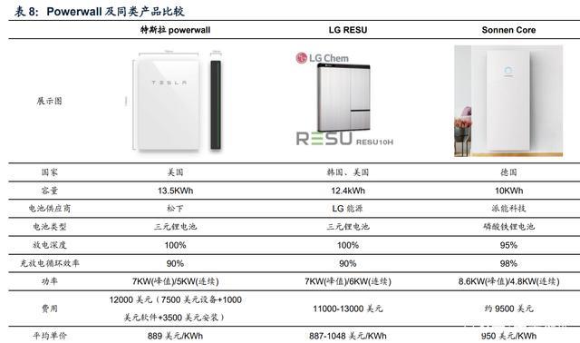 Powerwall 打開家庭儲能需求。2015 年 5 月,特斯拉首次推出 Powerwall 產(chǎn) 品,主打家庭儲能以存儲戶用光伏電量,7/10KWh 產(chǎn)品分別售價 3000/3500 美元; 2016 年 10 月,特斯拉發(fā)布二代 Powerwall 家用儲能設(shè)備,電芯采用與松下合作的 三元鋰電池,容量提升至 13.5KWh,此后由于需求高增特斯拉連續(xù)上調(diào)價格至 7500 美元并開啟與 Solar Roof 捆綁銷售模式。Powerwall 主要目的在于幫助家庭實現(xiàn)清 潔能源充電、增強系統(tǒng)用電獨立性,為用戶提供全方位能源供應(yīng)。此外用戶可以通 過特斯拉應(yīng)用程序,對發(fā)用電情況進行實時監(jiān)測,以滿足家庭特定用能需求。與同 類主流產(chǎn)品 LG RESU 和 Sonnen Core 對比,特斯拉 Powerwall 兼具美觀與經(jīng)濟屬 性,未來隨著磷酸鐵鋰電池海外市場認(rèn)可度的逐步提升,磷酸鐵鋰電池有望大規(guī)模 應(yīng)用于海外儲能領(lǐng)域,進一步下探產(chǎn)品價格。