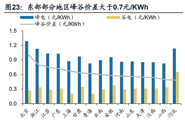 用戶側(cè)儲能需求激活,工商業(yè)配儲潛力打開。用戶側(cè)儲能主要目的在于分時電 價管理和兩部制電價下的容量電費管理,據(jù)我們測算在1.5元/Wh的儲能系統(tǒng)成本下, 峰谷價差大于0.7元/KWh可實現(xiàn)超10%的內(nèi)部收益率,配儲降本優(yōu)勢顯著。目前僅 北京、浙江、江蘇、廣東等東部主要省份工商業(yè)峰谷價差高于0.7元/KWh,政策明 確擴大峰谷價差將進一步驅(qū)動工商業(yè)配儲。未來伴隨峰谷價差進一步擴大、浮動電 價制度推進疊加儲能持續(xù)降本,儲能的“投資品”屬性愈發(fā)凸顯。