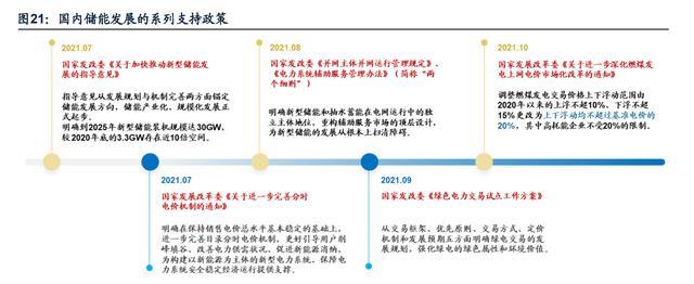 而對于制約儲能發(fā)展的機制問題,《指導(dǎo)意見》從市場地位、價格機制和激勵 機制三方面著手優(yōu)化,并在后續(xù)政策中有所體現(xiàn),例如明確儲能的市場主體地位在 2021年8月份發(fā)布的新版“兩個細(xì)則”中明確、完善峰谷價差政策在2021年7月份發(fā)布的《關(guān)于進一步完善分時電價機制的通知》中明確。我們認(rèn)為未來隨著儲能支持 政策的出臺提速,《指導(dǎo)意見》中的綱領(lǐng)性意見將由相關(guān)領(lǐng)域的政策文件補充,具 體細(xì)則有望持續(xù)優(yōu)化儲能發(fā)展模式,進一步打開行業(yè)發(fā)展空間。