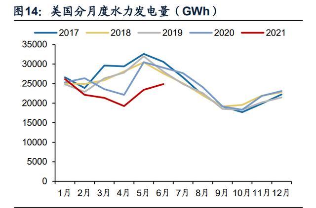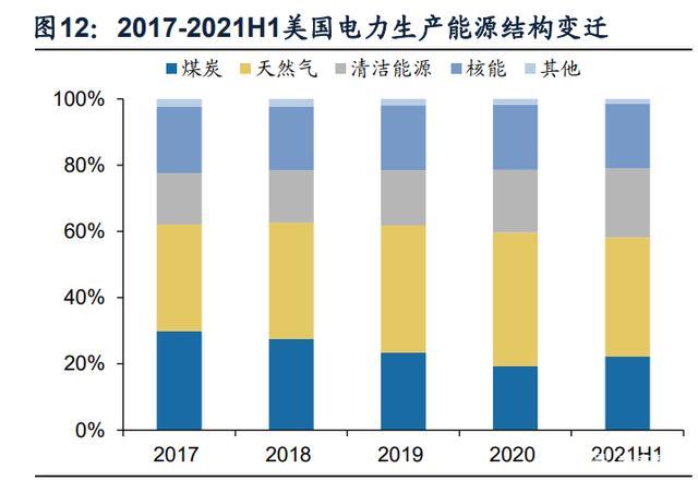 水電、風(fēng)電具備明顯的季節(jié)特性,歐美異常氣候?qū)е绿烊粴馓娲枨笤鲩L與電 力缺口產(chǎn)生。歐洲方面,2021 年以來長時間超高壓氣候?qū)е潞I巷L(fēng)速下降,風(fēng)力 發(fā)電量隨之下降,作為歐洲傳統(tǒng)的風(fēng)力發(fā)電旺季,在 2020 年風(fēng)電裝機新增14.7GW, 裝機規(guī)模增長 7.87%的條件下,2021H1 歐洲風(fēng)力發(fā)電量同比下降 7.47%。而美國 則受極端干旱天氣影響,2-6 月月度水力發(fā)電量均低于過去四年同期水平,2021H1 水力發(fā)電量同比下降12.59%,水電占比從2020年7.26%下降至2021H1的6.95%。 水電、風(fēng)電的不足致使歐美電力市場的天然氣替代需求提升,而天然氣供給短缺又 進一步拉大電力缺口。