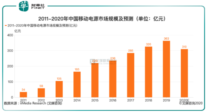 國內(nèi)移動電源市場方興未艾。據(jù)艾媒數(shù)據(jù)顯示,國內(nèi)移動電源市場規(guī)模持續(xù)擴(kuò)大,從2011年的34億元到2019年的363億元。但2020年智能手機(jī)出貨量增速下降,市場對移動電源需求略有下滑。