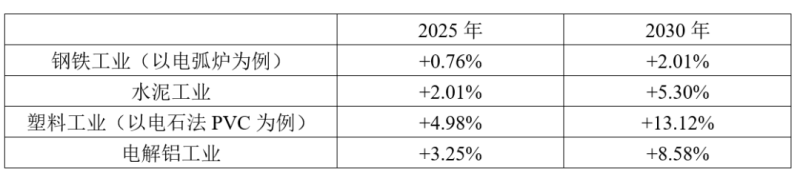 結(jié)果表明,2030年預(yù)測工業(yè)電價將對我國水泥工業(yè),電石法生產(chǎn)PVC的塑料行業(yè),以及電解行業(yè)造成顯著影響,導(dǎo)致其用電負(fù)擔(dān)分別上升5.30%,13.12%和8.58%。