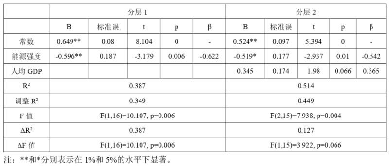將能源強(qiáng)度和人均GDP作為自變量,工業(yè)電價作為因變量,利用SPSS軟件開展分層回歸分析,得到如表3所示的分層回歸分析結(jié)果。