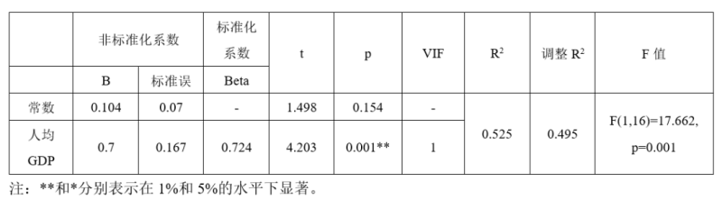 模型2在模型1的基礎(chǔ)上加入人均GDP后,F(xiàn)值變化沒有呈現(xiàn)出顯著性(ΔF=3.922, Δp=0.066>0.05),意味著人均GDP加入后對模型不具有解釋意義。