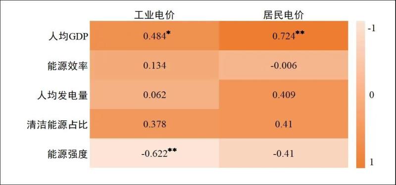 根據(jù)Pearson相關(guān)性分析結(jié)果,工業(yè)電價與人均GDP和能源強(qiáng)度之間相關(guān)關(guān)系顯著。工業(yè)電價與人均GDP之間的相關(guān)系數(shù)值為0.484,并且呈現(xiàn)出0.05水平的顯著性,說明工業(yè)電價和人均GDP之間有著顯著的正相關(guān)關(guān)系;工業(yè)電價和能源強(qiáng)度之間的相關(guān)系數(shù)值為-0.622,并且呈現(xiàn)出0.01水平的顯著性,說明工業(yè)電價和能源強(qiáng)度之間有著顯著的負(fù)相關(guān)關(guān)系。