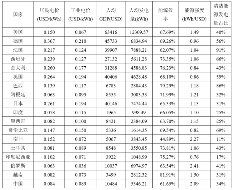 為探究電力市場的發(fā)展規(guī)律,篩選出與電價較為相關(guān)的影響因素,我們以中國,部分電力市場發(fā)展成熟的歐美發(fā)達(dá)國家,以及與中國產(chǎn)業(yè)結(jié)構(gòu)相似的制造業(yè)國家等共計18個國家為研究對象,選擇了人均GDP,能源效率,人均發(fā)電量,清潔能源占比,能源強(qiáng)度等因素作為自變量,工業(yè)電價和居民電價作為因變量開展Pearson相關(guān)性分析。各個國家的原始數(shù)據(jù)見表1,Pearson相關(guān)分析結(jié)果見圖12。