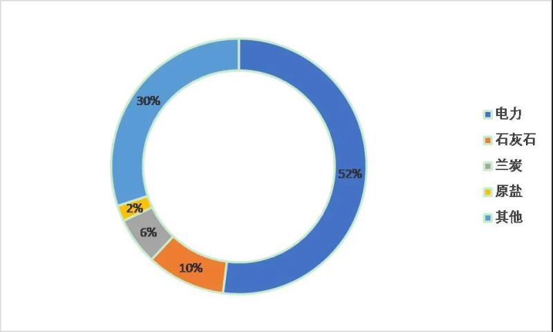 塑料產(chǎn)品按品類可劃分為聚丙烯(PP)、聚乙烯(PE)和聚氯乙烯(PVC)。我國的PVC工業(yè)是電力密集型的,主要有電石法和乙烯法這兩種制備工藝。受限于富煤、貧油、少氣的資源條件,我國主要以電石法生產(chǎn)PVC。電石法在生產(chǎn)PVC和焦炭制備電石時都需要耗費(fèi)電力,生產(chǎn)1噸PVC合計消耗電能約5450-5650 kWh,電力成本占總成本的52%左右,如圖10所示。