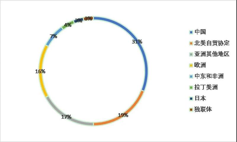 圖9 世界塑料產(chǎn)量占比(按地區(qū)),數(shù)據(jù)來自statista