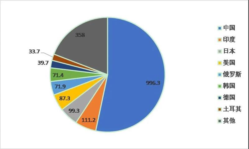 圖7 2019年世界主要鋼鐵生產(chǎn)國鋼鐵產(chǎn)量占比,單位:百萬噸,數(shù)據(jù)來自worldsteel