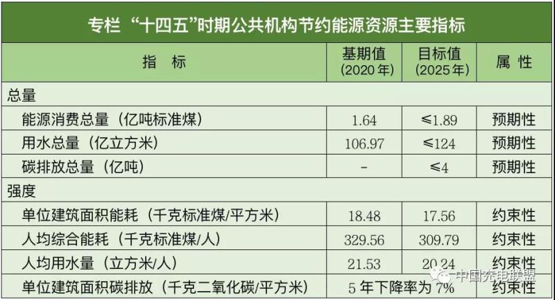 (四)主要目標。聚焦綠色低碳發(fā)展的目標,實現(xiàn)綠色低碳轉(zhuǎn)型行動推進有力,制度標準、目標管理、能力提升體系趨于完善,協(xié)同推進、資金保障、監(jiān)督考核機制運行通暢,開創(chuàng)公共機構節(jié)約能源資源綠色低碳發(fā)展新局面。實施公共機構能源和水資源消費總量與強度雙控,公共機構能源消費總量控制在1.89億噸標準煤以內(nèi),用水總量控制在124億立方米以內(nèi),二氧化碳排放(以下簡稱碳排放)總量控制在4億噸以內(nèi);以2020年能源、水資源消費以及碳排放為基數(shù),2025年公共機構單位建筑面積能耗下降5%、人均綜合能耗下降6%,人均用水量下降6%,單位建筑面積碳排放下降7%。