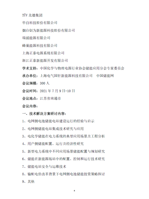 為進(jìn)一步探討在電網(wǎng)側(cè)及用戶側(cè)建設(shè)儲(chǔ)能電站,緩解高峰負(fù)荷對電網(wǎng)的沖擊,同時(shí)探索平滑新能源和調(diào)頻輔助服務(wù)等應(yīng)用模式,提升項(xiàng)目運(yùn)行經(jīng)濟(jì)性,中國化學(xué)與物理電源行業(yè)協(xié)會(huì)儲(chǔ)能應(yīng)用分會(huì)決定聯(lián)合江蘇省電機(jī)工程學(xué)會(huì)、中國能源建設(shè)集團(tuán)江蘇省電力設(shè)計(jì)院有限公司等單位于2021年7月9—10日在江蘇省南通市召開“第五屆全國電網(wǎng)側(cè)暨用戶側(cè)儲(chǔ)能技術(shù)應(yīng)用高層研討會(huì)”,具體安排如下: