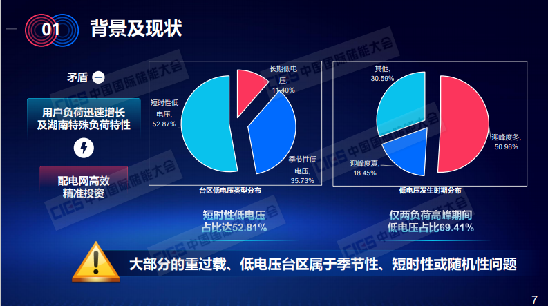 這是我們2020年對全省的配電變壓器過載現(xiàn)狀進(jìn)行的分析,我們發(fā)現(xiàn)有76%的配變過載集中在春節(jié)前后,而這些配變平均一年的重過載天數(shù)僅僅也只有7.75天,平均重過載時(shí)長只有62.9個(gè)小時(shí)。因此,對于湖南來說,重過載與輕載并存的現(xiàn)象非常突出。此外,我們對低電壓臺(tái)區(qū)的情況也進(jìn)行了分析,發(fā)現(xiàn)短時(shí)性低電壓占比達(dá)52.81%,僅1月、2月和8月兩負(fù)荷高峰期間發(fā)生的低電壓占比就達(dá)到了69.41%。由此,我們可以得到結(jié)論,大部分的重過載低電壓臺(tái)區(qū)是屬于季節(jié)性、短時(shí)性或隨機(jī)性的問題。