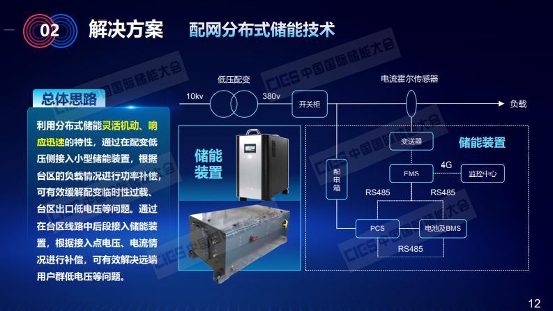 而儲(chǔ)能技術(shù)和物聯(lián)網(wǎng)技術(shù)的發(fā)展,為我們解決這兩個(gè)矛盾提出了一個(gè)新的思路,下面我們來介紹解決方案。第一,是我們剛才提到的配網(wǎng)側(cè)分布式儲(chǔ)能技術(shù)??傮w思路如下,它主要是利用分布式儲(chǔ)能靈活機(jī)動(dòng)、響應(yīng)迅速的特性,通過在配電臺(tái)區(qū)380V的主線并聯(lián)接入儲(chǔ)能裝置,通過實(shí)時(shí)監(jiān)控臺(tái)區(qū)以及用戶側(cè)的負(fù)荷、電流、電壓等相關(guān)的負(fù)荷數(shù)據(jù),在系統(tǒng)有需要的進(jìn)行實(shí)時(shí)就地的功率補(bǔ)充,以此解決相應(yīng)的重過載問題。解決低電壓的問題,一般來說用戶低電壓是出現(xiàn)在臺(tái)區(qū)的末端,也就是380V主線后端位置,在這種情況下,我們會(huì)將儲(chǔ)能裝置并聯(lián)接入末端集中低電壓用戶群前面一點(diǎn)點(diǎn)的位置,通過監(jiān)測接入點(diǎn)的電壓、電流等相關(guān)數(shù)據(jù),進(jìn)行就地補(bǔ)充,以此減少主線上因?yàn)榇筘?fù)荷電流所產(chǎn)生的壓降,以此來解決負(fù)荷側(cè)的低電壓問題,這點(diǎn)對于山區(qū)用戶是非常有效的。